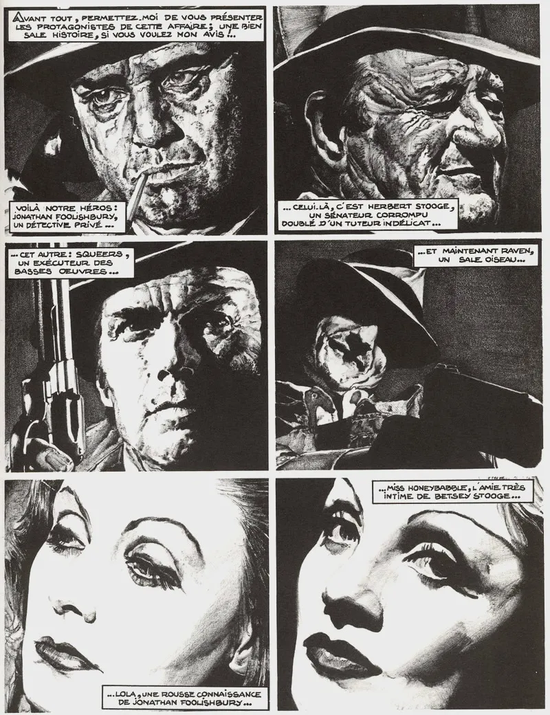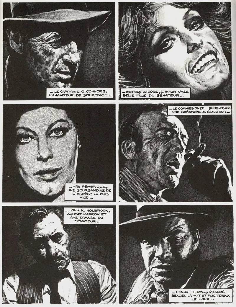 Jean-Claude Claeys, grand amateur de polar, nous entraine dans la plus pure tradition du hard boiled sur les traces de son détective qui prend pour l'occasion les traits de Marlon Brando. Noir et blanc de rigueur, ambiance glauque à souhait, corruption, coups tordus, violence, sexe, tous les ingrédients du genre sont présents et on croise au fil des planches une incroyable brochette des stars du cinéma hollywoodien qui ont fait les grandes heures des films noirs. Car si Brando est en bonne place, il n'est pas le seul à prêter sa plastique à cet illustrateur pointilleux ; il y a même comme une gageure à vouloir tous les reconnaître : les Robert Mitchum, Henry Fonda, Marlene Dietrich, Clint Eastwood, John Wayne, Marilyn Monroe et j'en passe...